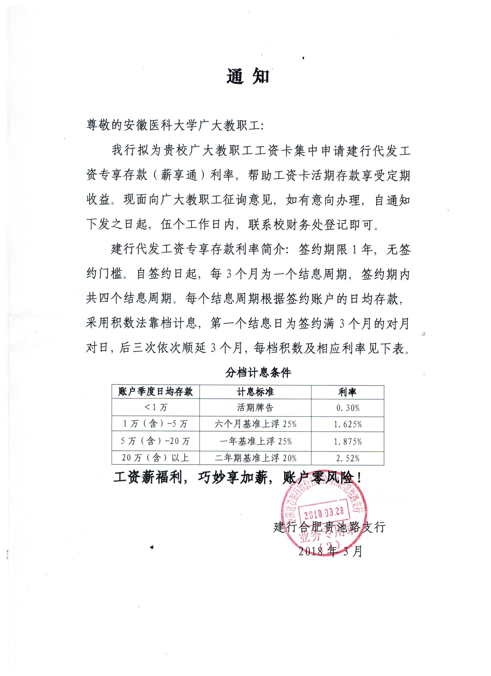 建行合肥市贵池路支行拟为学校职工集中办理代发工资专享存款(薪享通)利率,帮助职工工资卡活期存款享受定期收益。我校职工可自愿申办。
